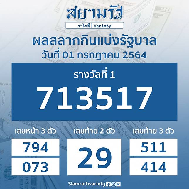 ประกาศผลสลากกินแบ่งรัฐบาล งวดวันที่ 1 กรกฎาคม 2564 รางวัลที่ 1 ได้แก่ รางวัลเลขท้าย 2 ตัว ได้แก่ 29.